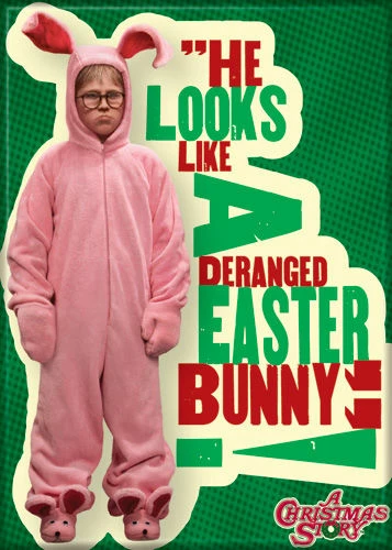3 1/2″ x 2 1/2″ magnet of “He Looks Like A Deranged Easter Bunny.” quote from A Christmas Story.