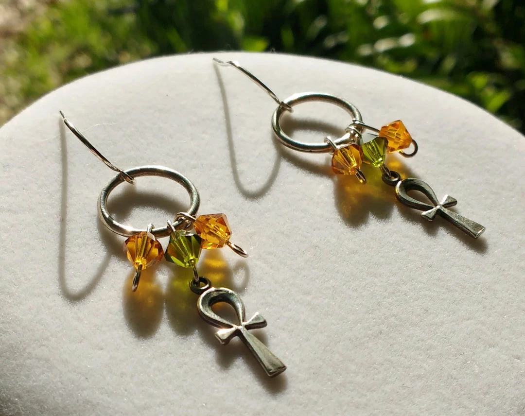 The Ankh is a powerful Ancient Egyptian Symbol for life, combined here with the colors Orange, for the Sacral Chakra, and Green for the Heart Chakra, to connect your Creative Power to your Heart, and hang from your ears to help you See and Know your Truth. Earrings dangle approximately 1 1/2 inches.