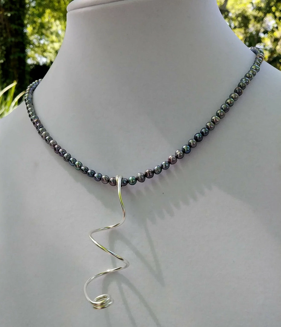 This lavender freshwater pearl necklace is perfect for many styles and is created with a Freeform Silver wire pendant. This beautiful necklace measures approximately 18 1/2 inches in length and the Freeform Silver pendant is approximately 2 1/2 inches in length. It is finished with Sterling Silver crimps, clasp, and rings.