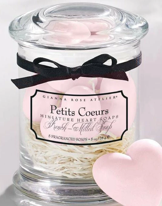 Five charming heart-shaped guest soaps elegantly nestled in a reusable glass apothecary jar. Lightly scented with Jasmine, Lavender, and Passion Flower. A beautiful and exquisite gift. Five 1 oz. soaps.