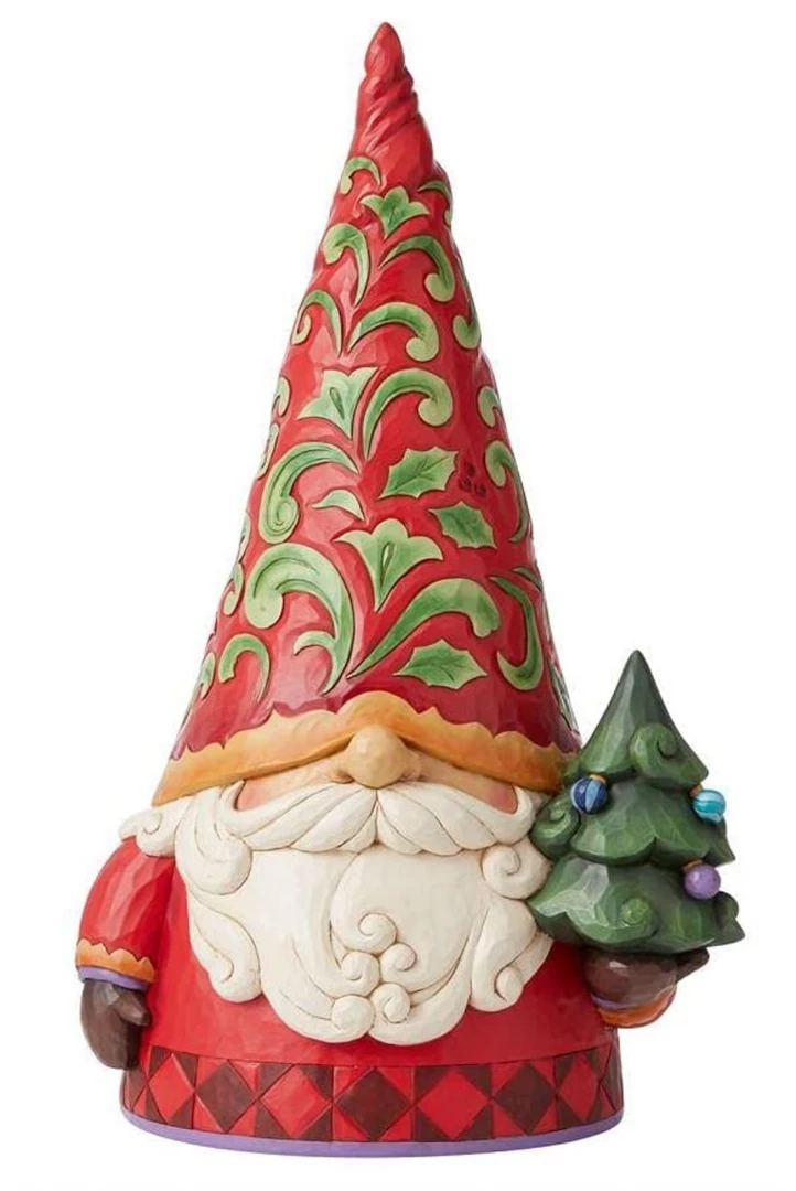 Jim Shore Christmas gnome statue. There’s no place like gnome for Christmas! Celebrate the season with this incredibly crafted holiday gnome by Jim Shore. Patterned in delicate engravings and holly this eighteen inch gnome holds a little tree with ornaments.