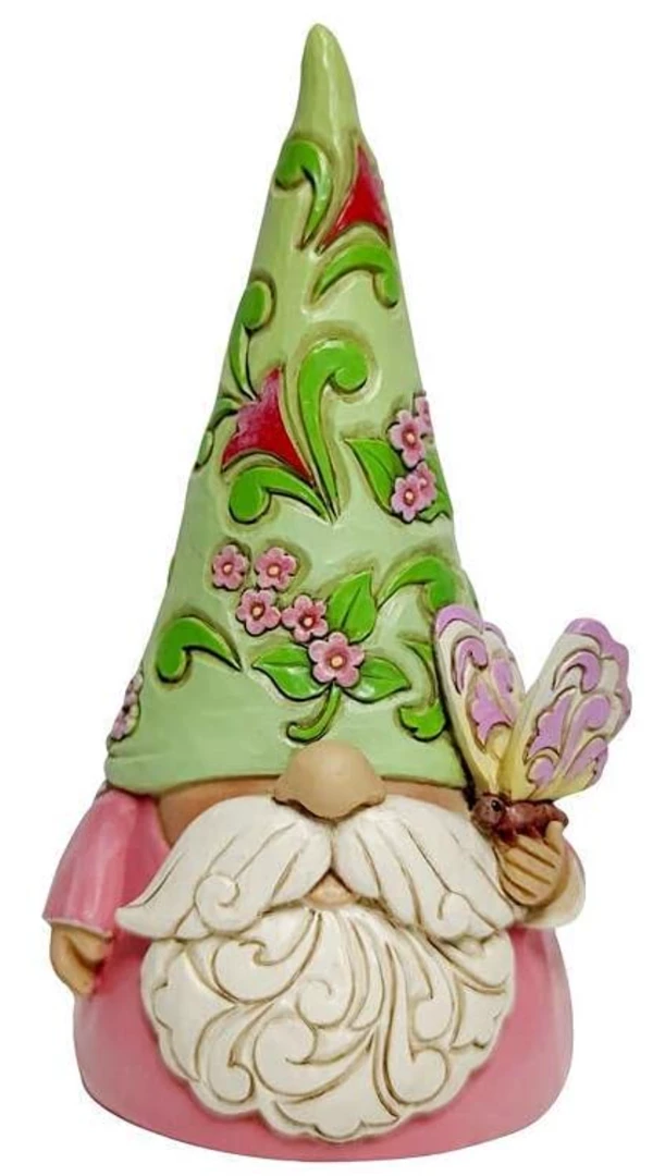 For centuries, gnomes have been symbols of good luck, they are thought to provide protection with their delightful charm. This Jim Shore gnome wearing a floral hat finds a surprise guest visiting his garden, a beautiful butterfly.