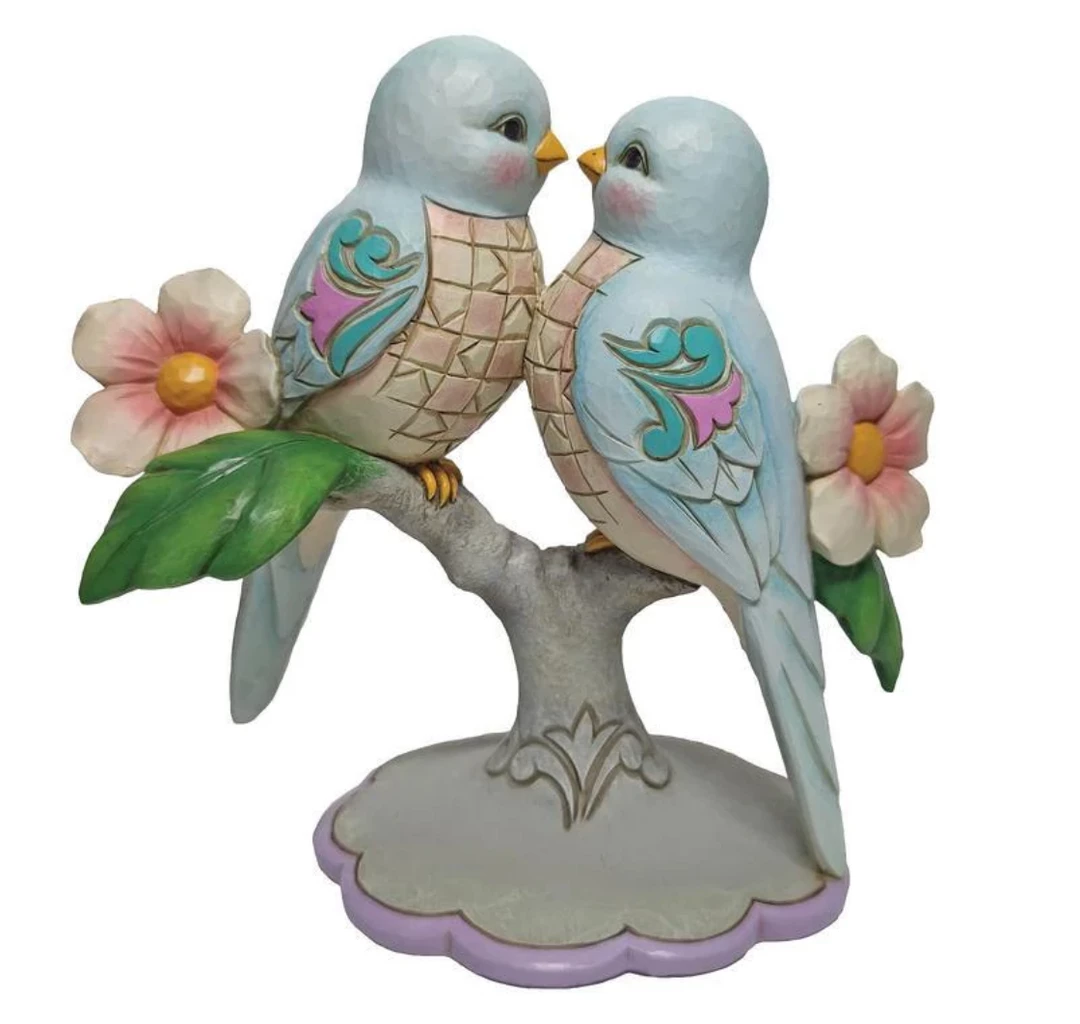 Beak to beak, these two bluebirds stare into each other’s eyes with understanding and appreciation. Honoring both love and friendship, the pair share a branch of pink flowers and beautifully patterned matching plumage in this Jim Shore gift.