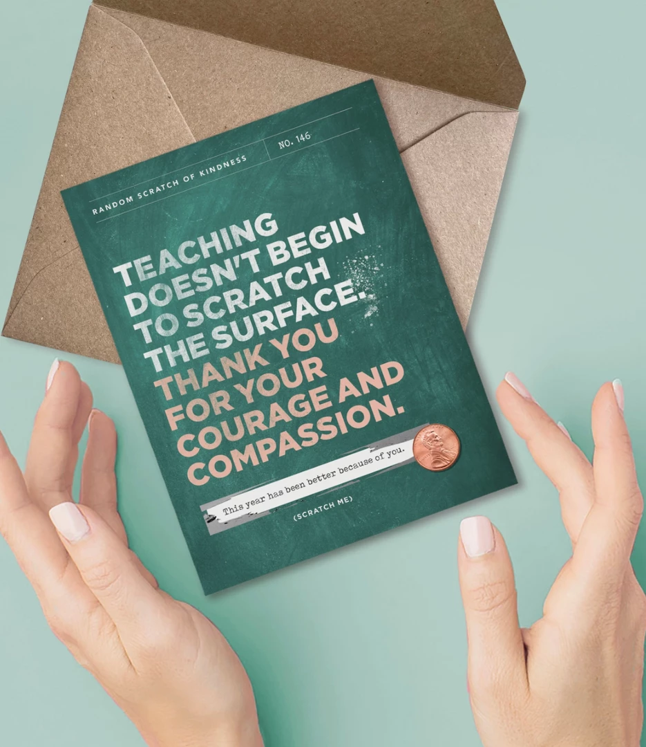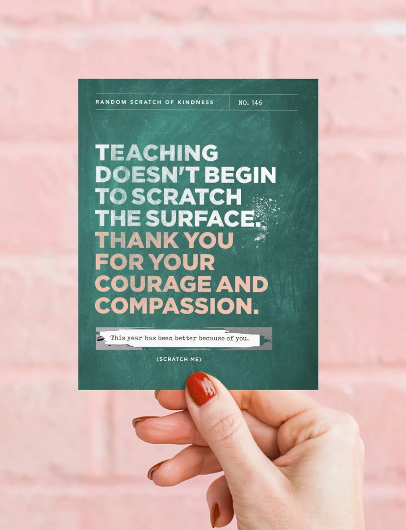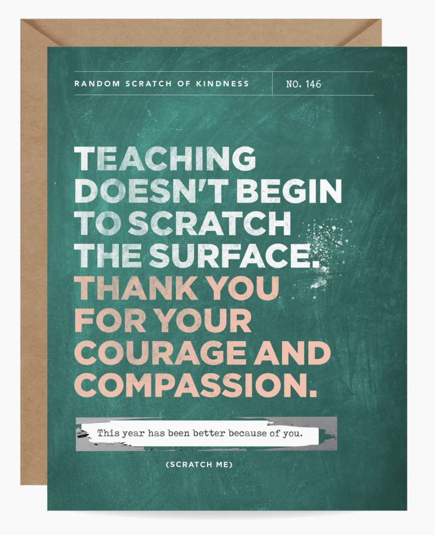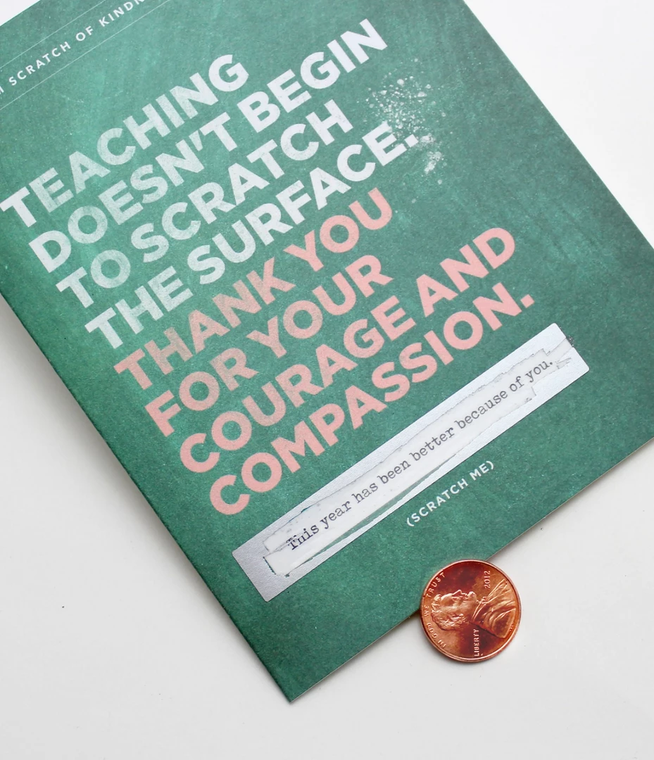 For teachers or educators! Scratch to reveal a hidden message: “This year has been better because of you.” This card is perfect for teacher appreciation gifts! *Card includes a high quality kraft envelope with a euro flap. All Inklings scratch-off cards come packaged with a photo insert in the back showing exactly what the recipient will see when they scratch!