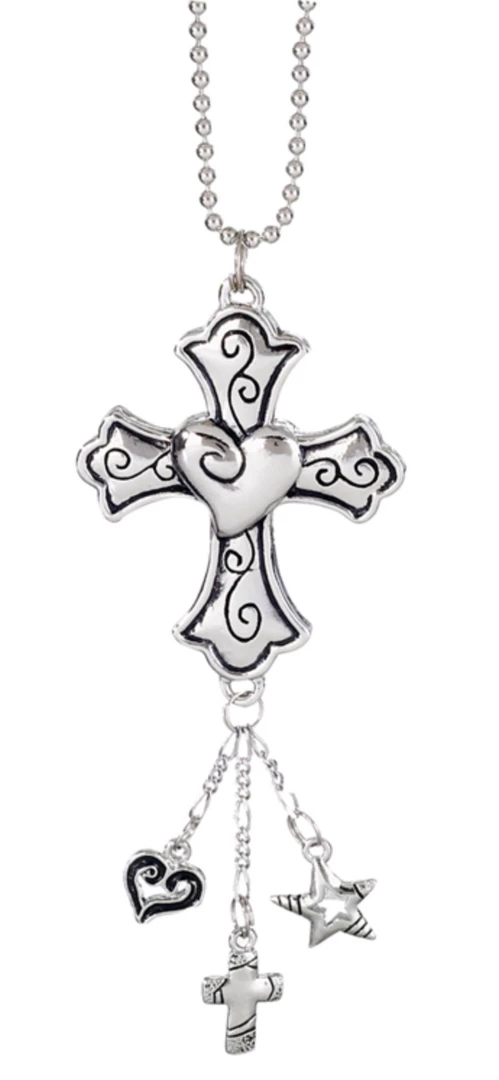 A beautiful cross design to accompany you on your travels, this car charm is a lovely cross featuring dangling charms from the center. Measures approximately 3″ and 7″ with hanging chain. Makes a great gift for a new car, friends, teachers, or co-workers.
