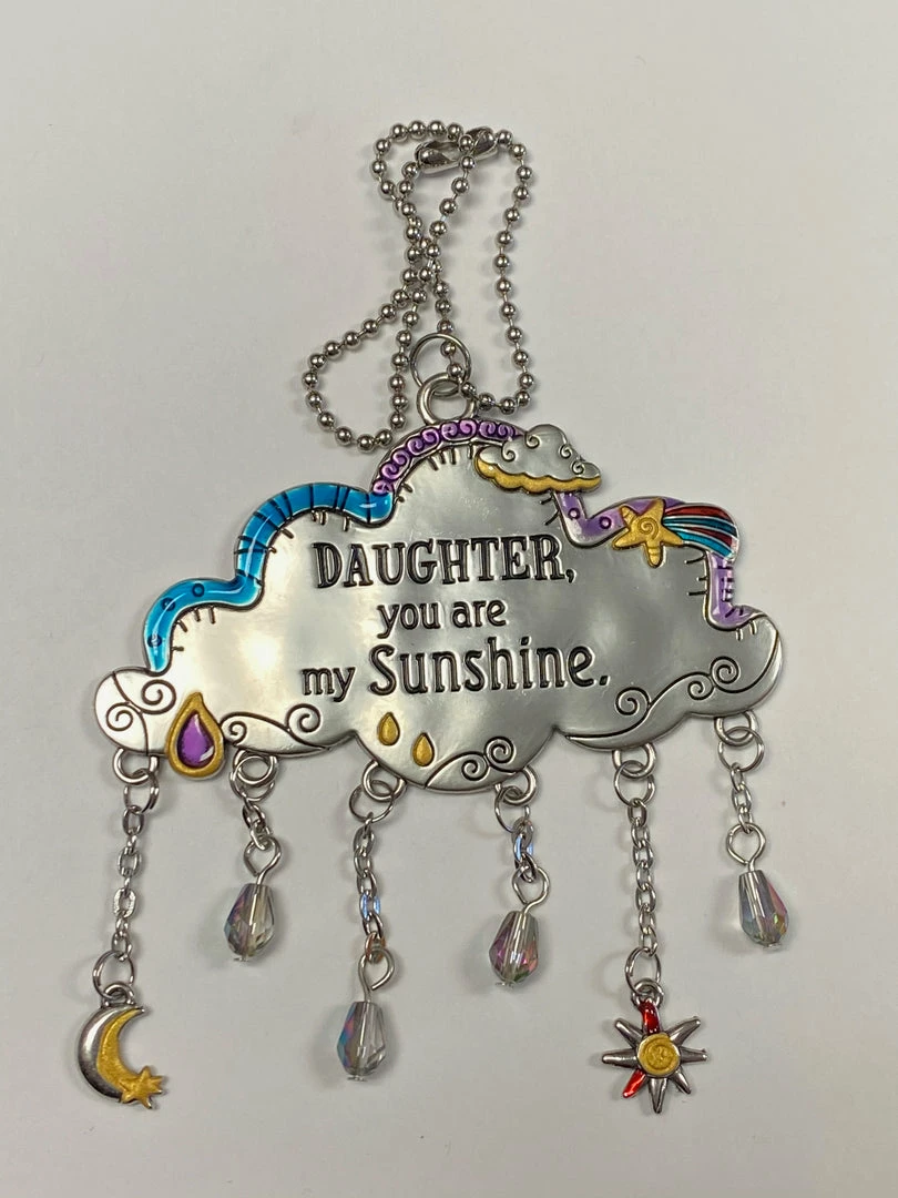 A beautiful cloud design to accompany you on your travels. This car charm has the saying Daughter You Are My Sunshine with charms dangling from the center. Makes a great gift for a new car, friends, teachers, or co-workers.