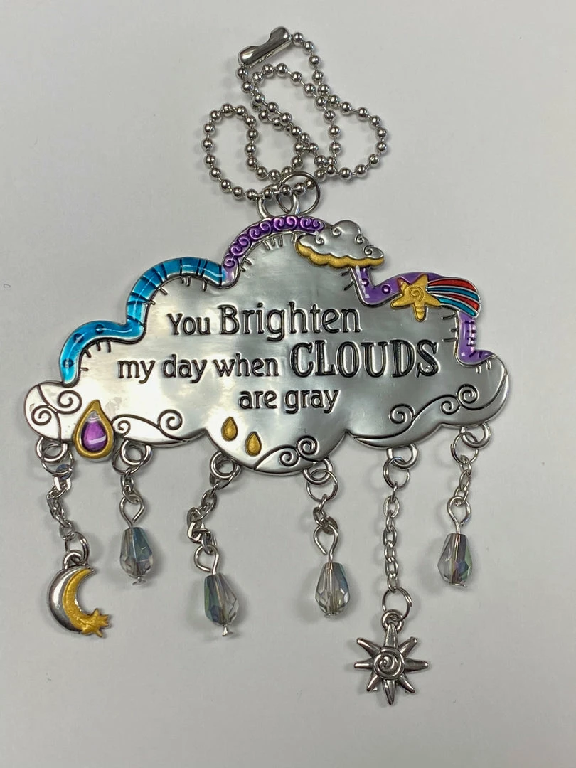 Aย beautiful cloudย design to accompany you on your travels. This car charm has the saying You Brighten My Day When Clouds Are Gray withย charms dangling from the center. Makes a great gift for a new car, friends, teachers, or co-workers.