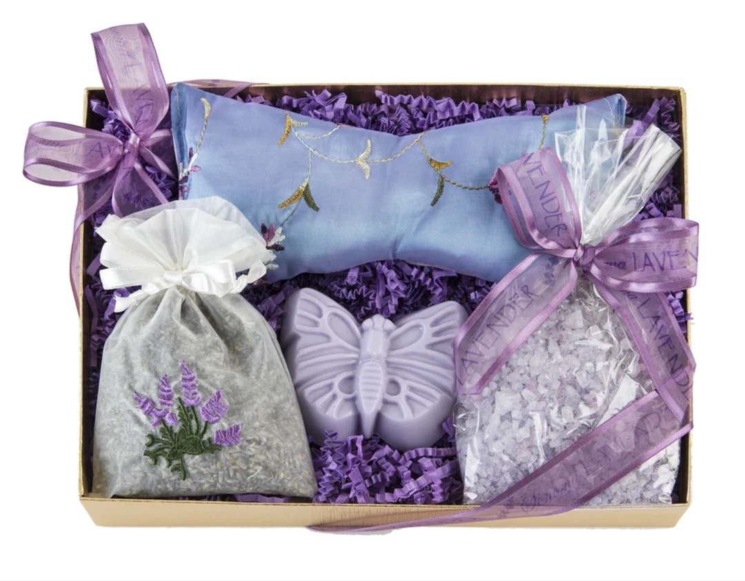 A gorgeous gift box providing the path to restful sleep. Includes a lavender eye pillow (4.5oz), lavender sachet (1.5oz), lavender bath salt (8oz) and lavender butterfly soap (3oz). All handcrafted in our California workshop.ย Hand wrapped in a lavender ribbon and bow for a wonderful gift.ย