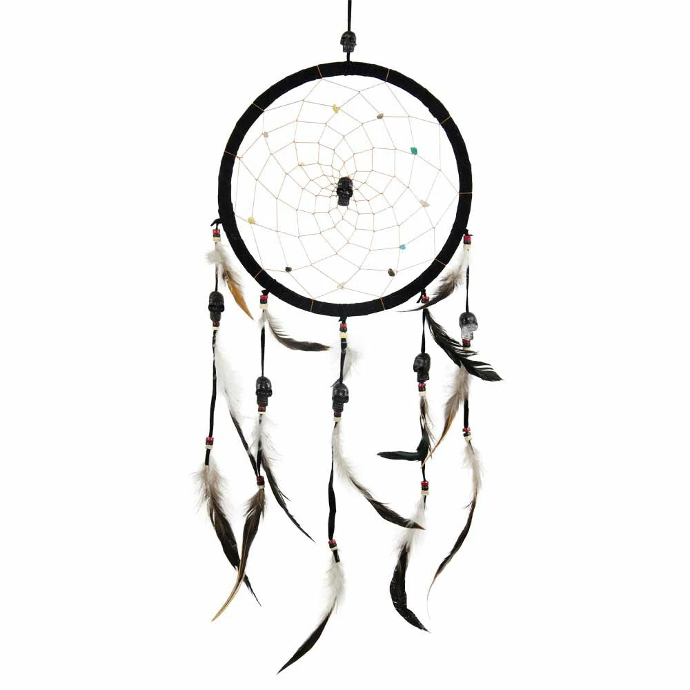 Black skulls, represent our ancestors, have been woven into the web of this captivating dream catcher. Additional skulls flow from feather strands to capture the wisdom and teachings of our ancestors. Skulls made of resin. Diameter in Inches: 8.5