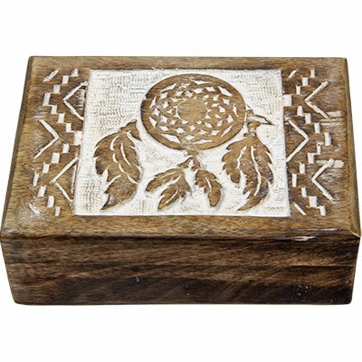 The captivating image of a dream catcher accented by an Aztec tribal pattern has been skillfully carved onto the lid of this mango wood box. Smooth polished sides complete the design. This velvet lined box is great for storing precious stones, crystals, jewelry, tarot cards or small keepsakes. Width in Inches: 5, Length in Inches: 7