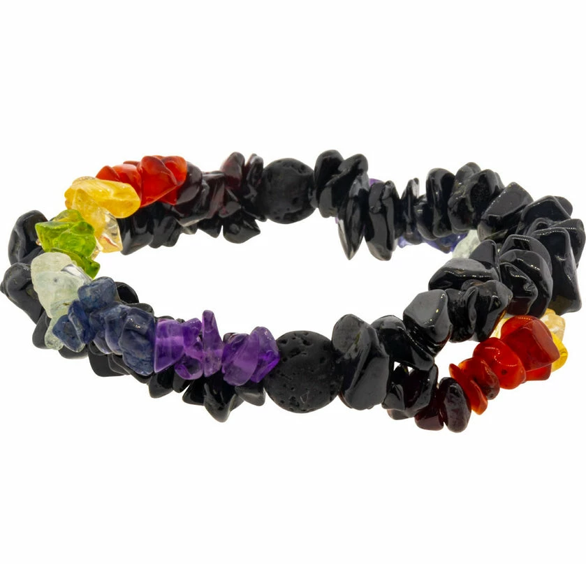 Beautiful gemstone chips adorn this bracelet in the hues of the 7 major chakras for energizing and balance with black tourmaline and paired with a natural diffuser to enhance your intention, lava stones are a perfect choice for aromatherapy essential and fragrance oils.