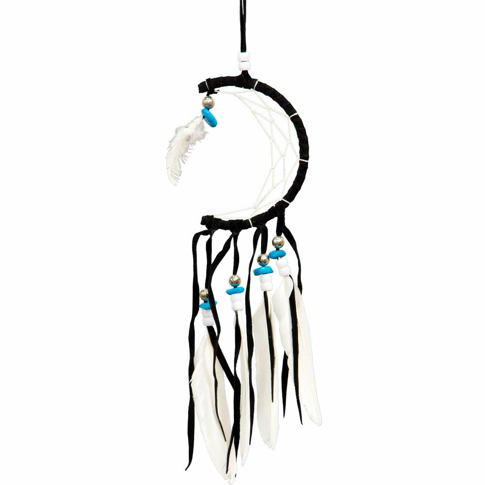Tightly wrapped faux black suede has been cleverly wrapped to form the shape of a crescent moon. White feathers flow from black strands accented with turquoise, silver and white beads to complete the design of this unique dreamcatcher.ย Diameter in Inches: 3