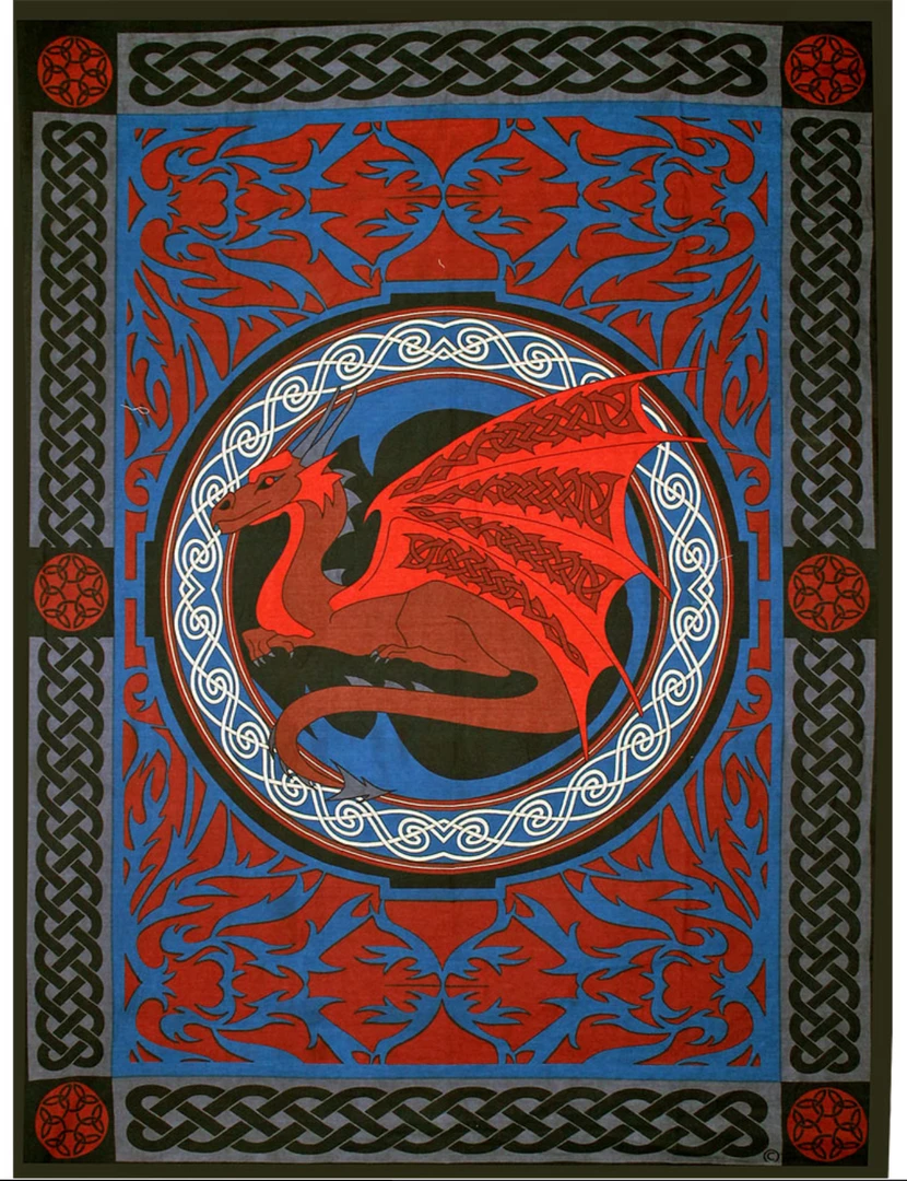 Beautiful tapestry with celtic knot and celtic braids surrounding a red dragon.