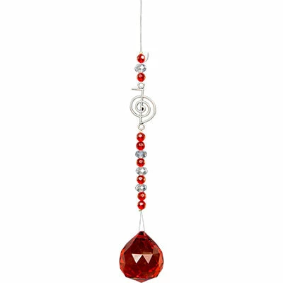 A delightful multi-faceted crystal sphere hangs from a strand of cut glass beads. Woven amongst the beads is pewter-toned Flower of Life. Hang the crystal in your home, patio or garden; anywhere you want to add sparkle and shine. 30mm sphere; 6″ h x 6″ l