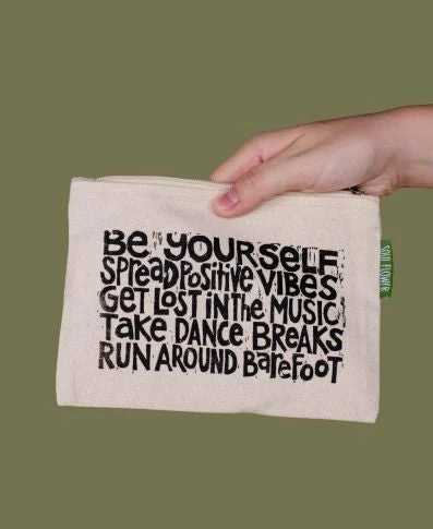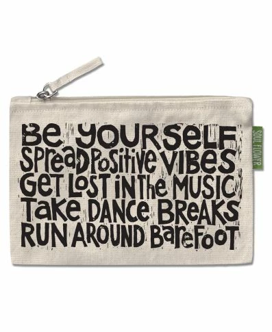 Let this eco-friendly pouch inspire you to stay true to yourself! Pouch reads: be yourself ~ spread positive vibes ~ get lost in the music ~ take dance breaks ~ run around barefoot. These positive words, taken from the Soul Flower Manifesto, will help keep you inspired and organized! Use this positive messages pouch to hold your jewelry, makeup, or art supplies. And spread even more love with the matching pieces: Manifesto Small Zipper Pouch and Manifesto Eco Tote Bag. 8.5 x 6 inch pouch. Fair Trade Certified. Hand printed in the USA. 100% organic cotton.