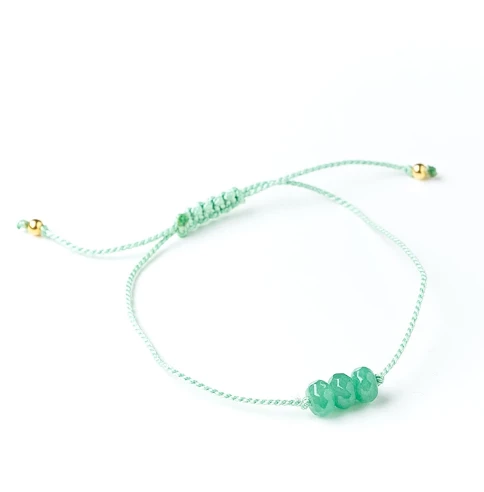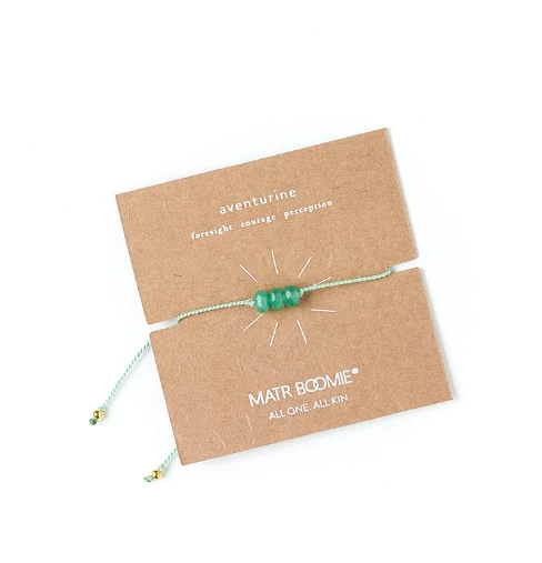 Our handcrafted Indali bracelets feature semiprecious stone beads and adjustable, sliding knot design. This bracelet features three Aventurine gemstone beads on soft, twisted cord of complementary color. Green Aventurine is often referred to as the ‘Stone of Opportunity,’ associated with an increased ability to achieve one’s goals thru the release of negative energies and past blockages. Global Fair Trade handmade gift by artisans in India. 9″ L adjustable.