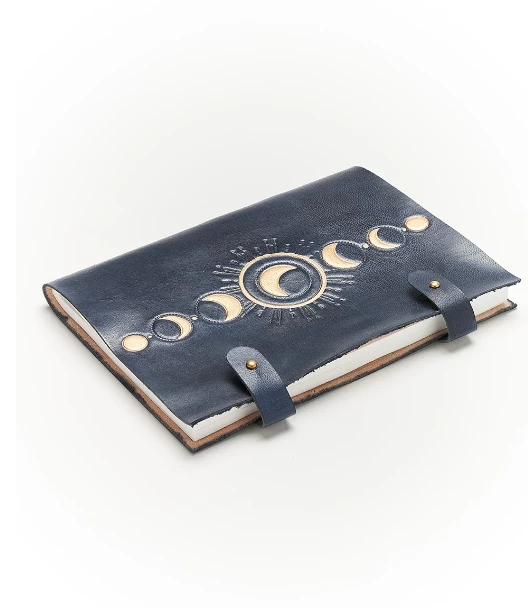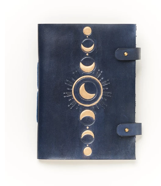 Our Indukala Journal Collection embraces the traditional Indian art of cotton paper making passed on for generations in Rajasthan, India, featuring enchanting, lunar-inspired designs. Artisans convert cotton waste into a pulp to create richly textured, 100% tree-free paper pages with a uniquely soft feel. This journal applies combined local art forms of paper making and traditional techniques in Indian leather craft and tooling, utilizing ethically sourced, cruelty-free leather. This handcrafted, soft leather journal features an embossed, gold metallic lunar phase design, 96 soft cotton pages front and back, and dual tab closures. Dimensions: 5″L, 7″W