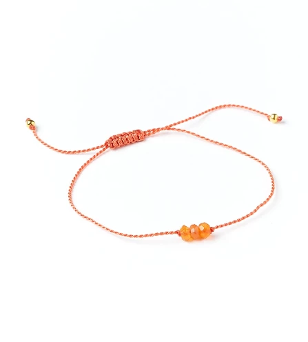 Our handcrafted Indali bracelets feature semiprecious stone beads and adjustable, sliding knot design. This bracelet features three Carnelian gemstone beads on soft, twisted cord of complementary color. Carnelian is cherished for its powerful energizing and grounding qualities, associated with increased motivation, action towards goals, and whole body vitality. Global Fair Trade handmade gift by artisans in India. 9″ L adjustable.