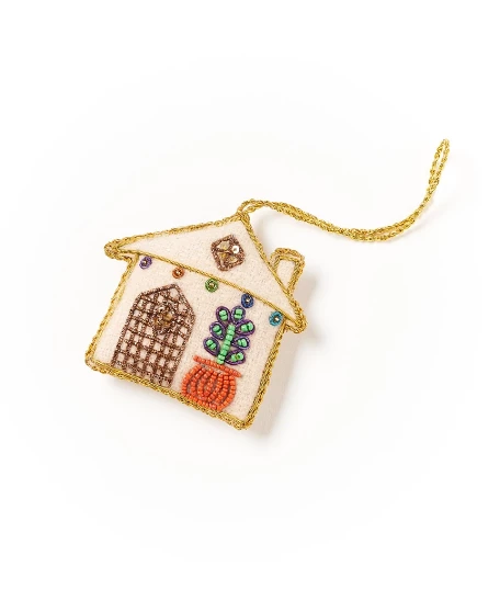 Our Larissa Plush Ornament Collection features soft, cheerful designs brought to life by master artisans in New Delhi. Ornate embellishment is a proud cultural tradition in India, an art form cultivated and passed down from one generation to the next. This handcrafted felt plush ornament features a cozy home design with vibrant embellishment, gold metallic trim, and gold metallic hanging loop. Global Fair Trade handmade gift by artisans in India.Β 2.75″L x 3″W