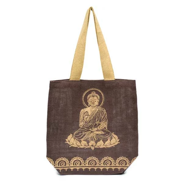 Jute tote bag in rich mocha brown features gold metallic screenprint of exclusive Buddha illustration, sturdy woven handles and zipper. Additional styles include our Metallic Ganesha Jute Tote in deep forest green.ย Dimensions: 14″ x 0.25″ x 14.5″, Drop 11″