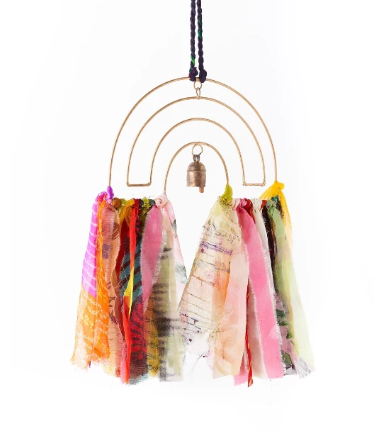 Upcycled metal chime in unique Rainbow design features a handcrafted copper bell, vibrant assorted sari tassels, and twisted sari hanging loop. The center rainbow loop swivels independently. Due to the upcycled nature of the sari material used in this product, expect variation in colors and patterns, please reach out for us for photos of in stock chimes. Global Fair Trade handmade gift by artisans in India. 15″L, 10″W