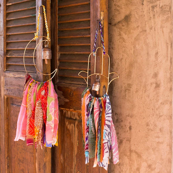 Upcycled metal chime in Hamsa hand design features handcrafted copper bell, vibrant assorted sari tassels, and twisted sari hanging loop. Due to the upcycled nature of the sari material used in this product, expect variation in colors and patterns. Dimensions: 22″ L overall; 18″ L, 7.5″ W hanging, please contact us for current colors and designs in stock.