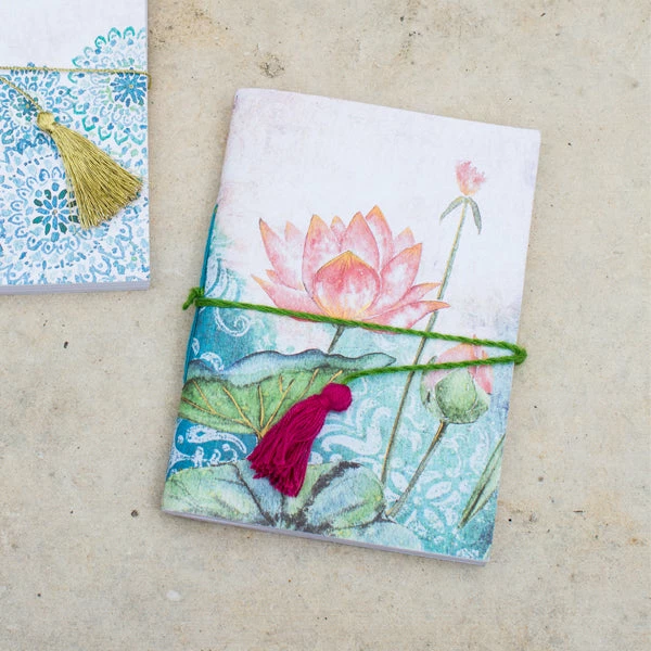 Softbound 96-page journal featuring a lotus flower scene with hand painted details in 100% tree-free recycled cotton paper. Artisans collect cotton waste and turn it into a pulp to create a rich textured paper with a uniquely soft feel. Tie and tassel closure, dimensions 5″ x 7″