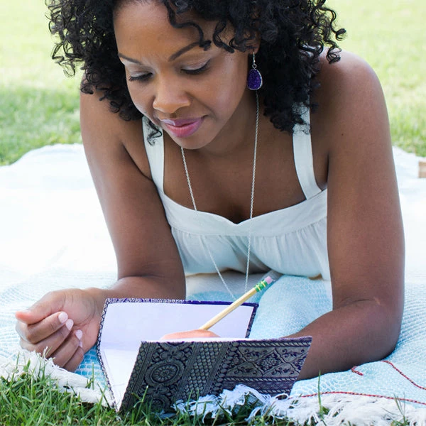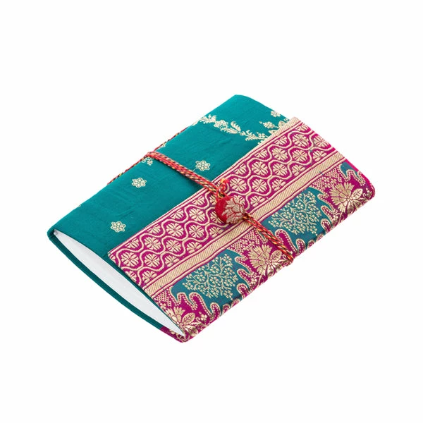 Upcycled sari journal cover holding 96 pages of 100% tree-free recycled cotton paper. Artisans collect cotton waste and turn it into a pulp to create a rich textured paper with a uniquely soft feel. String tie closure. Assorted designs and colors, dimensions 5″ x 7″