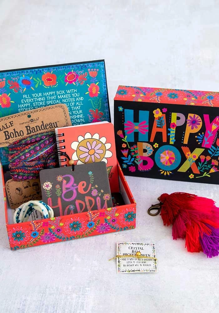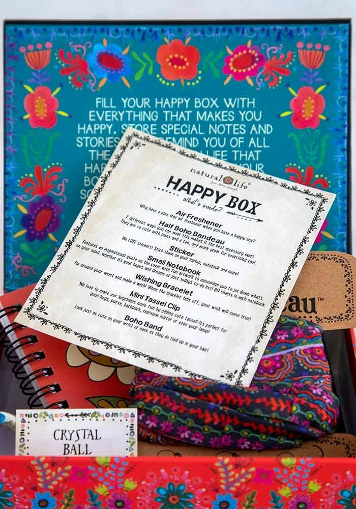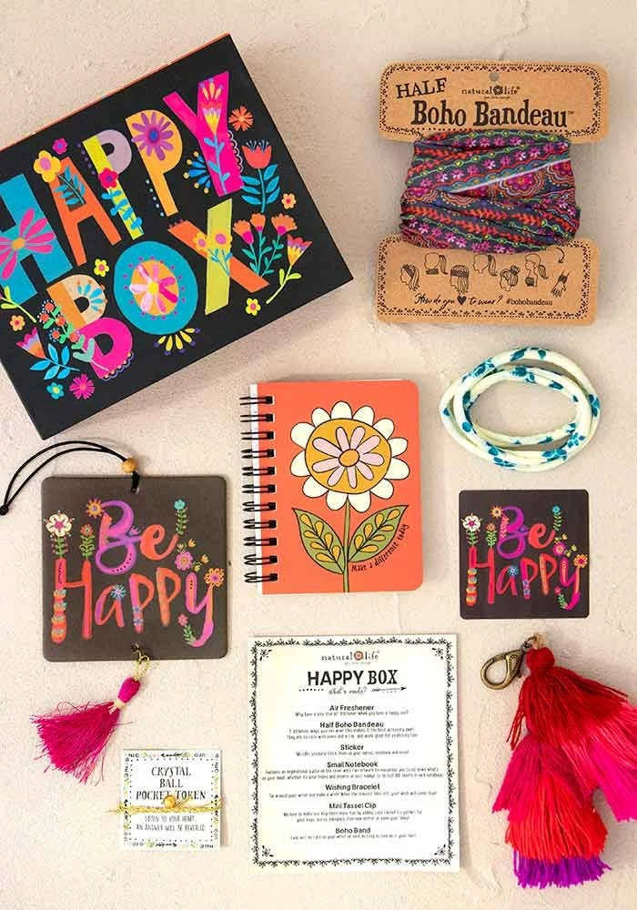 A Happy Box is the Best Gift Ever! We took 6 of our most popular “little treasures” and packaged them inside a decorated keepsake Happy Box! The box itself is the best part! Each box differs a little but contains things like Boho Bandeaus, Air Fresheners, Bracelets, Happy Clips, Tiny Tin Happy Notes and phone pockets.