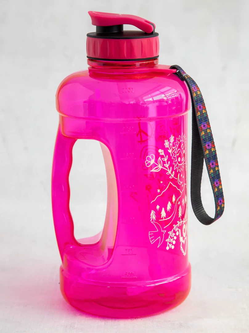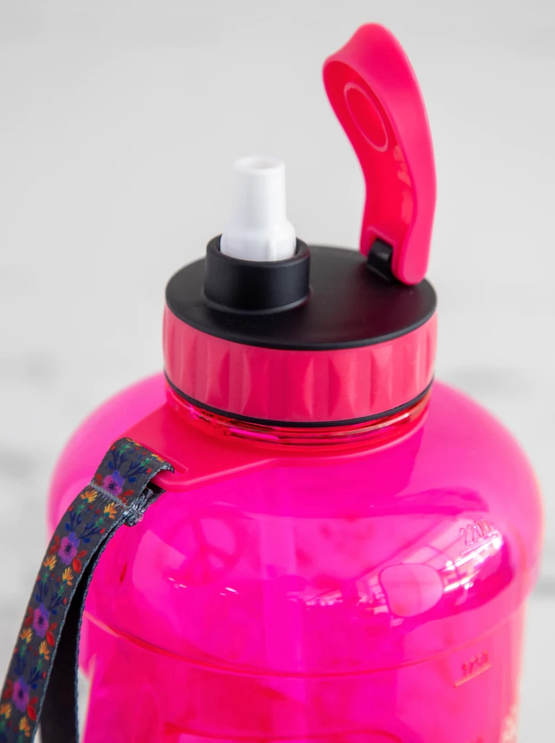 - Holds a half gallon of water, so you won’t be wasting your time re-filling your water bottle. The wide-mouth opening makes it easy for you to clean and add supplements. Features straw, hinged closure and carrying strap