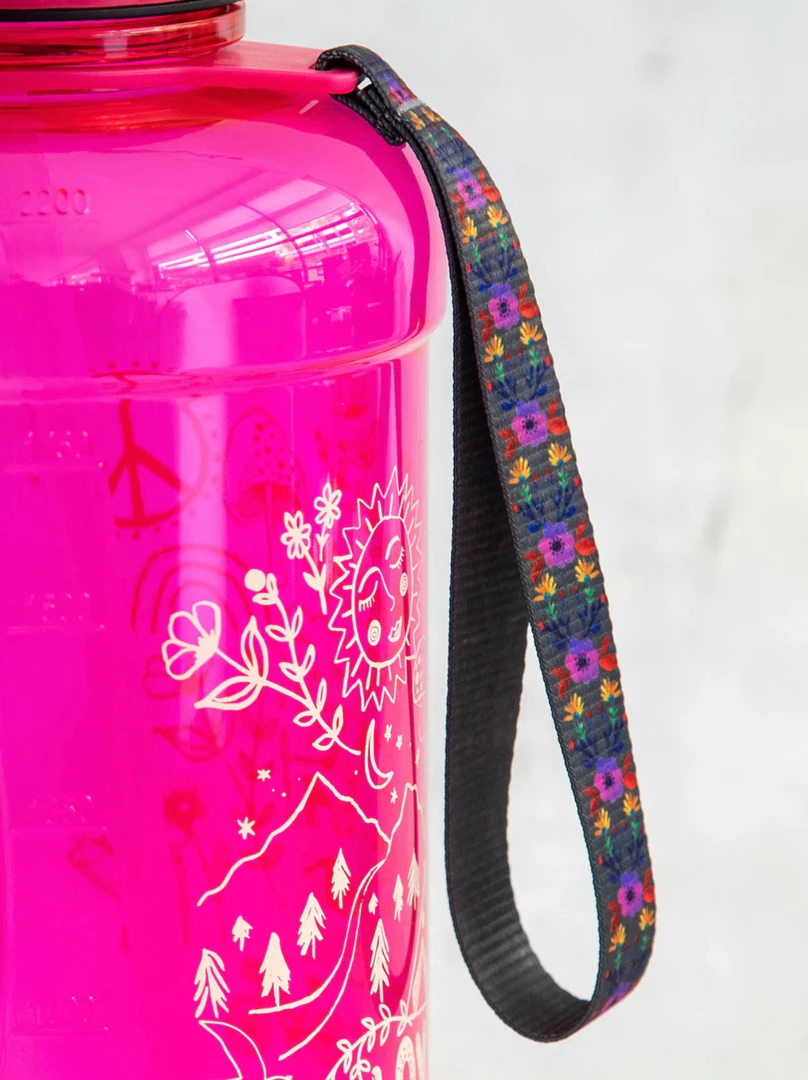 The Drink Up Water Bottle is so awesome! Itโs great for keeping track of your water intake throughout the day, either by hour or by volume! Theย teal color holds 33 ounces of water and fits in our Water Bottle Carriers and the dark pink holds 74 ounces!ย It features doodle art and the cutest printed strap for easy carrying! We carry ours around everywhere we go!