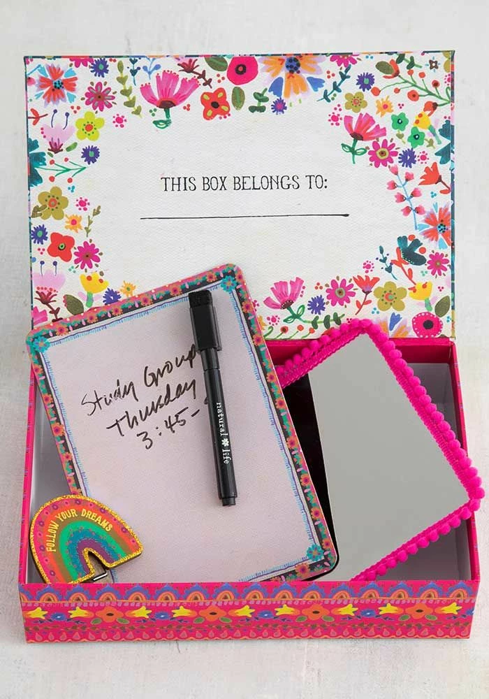 - Pencil Box includes: 1 Locker Magnet, 1 Magnetic Message Board with Dry Erase Marker, 1 Magnet Happy Clip, 1 Magnetic Mirror, 1 Air Freshener, 36 in of Decorative Trim