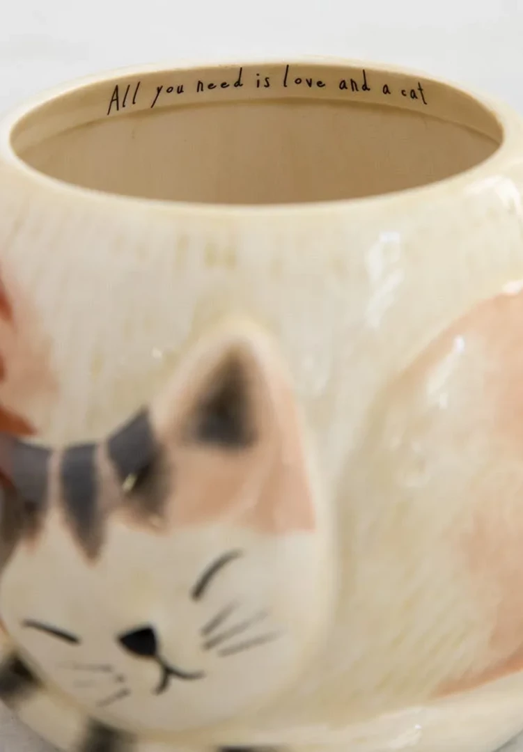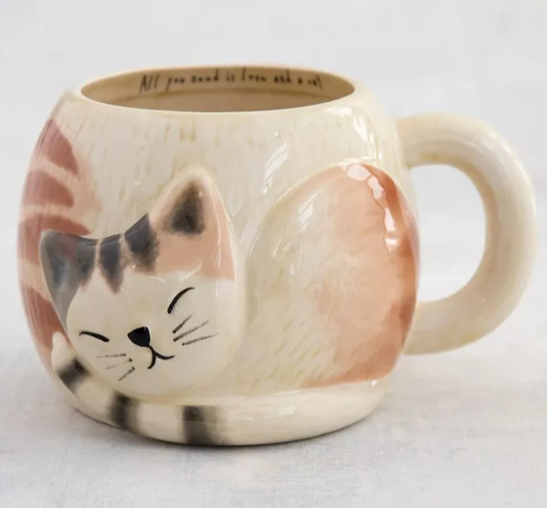 The CUTEST mug to make you smile every time you drink from it! Hand sculpted with a message “All you need is love and a cat” on the inside rim to inspire you to start your day off right… it will be your new favorite!! Ceramic, 16 oz, dishwasher and do not microwave. Measures 3.75H x 3.25 diameter.