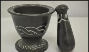 A mortar & pestle is used to grind together herbs and incense resins. The stick-shaped pestle crushes the ingredients in the bowl. Made of carved soapstone. Black Soap Stone Celtic Knot Carved Black Mortar & Pestle 3” x 3” x 2.5” A wonderful piece for grinding or mixing herbs, resins, spices, and woods.