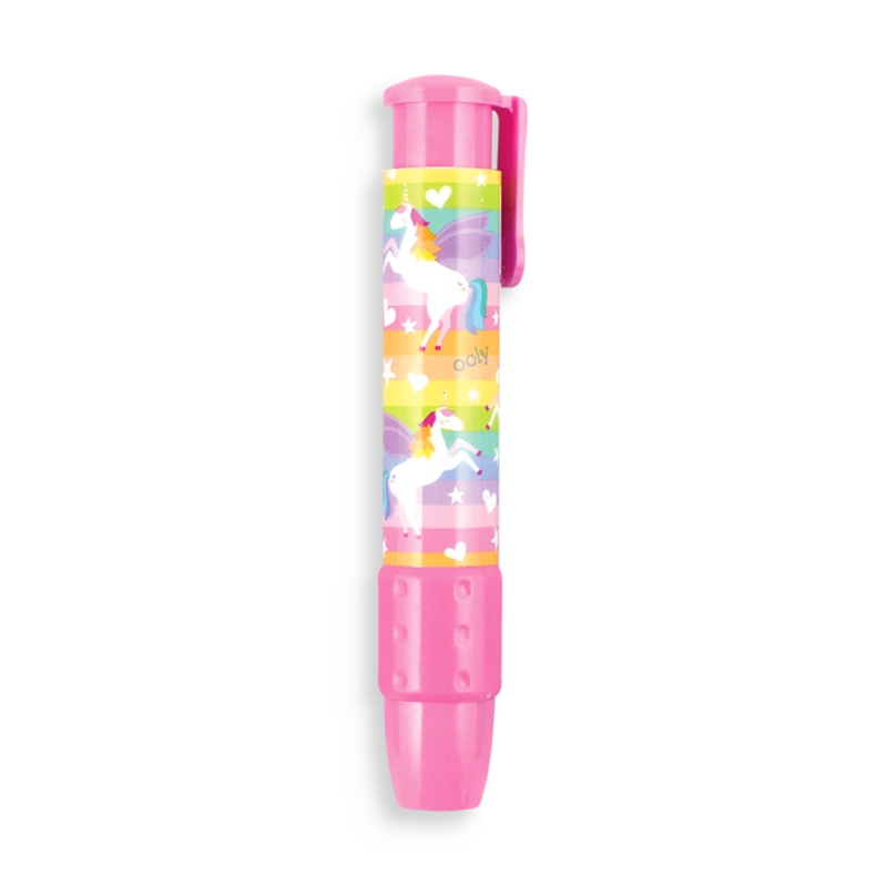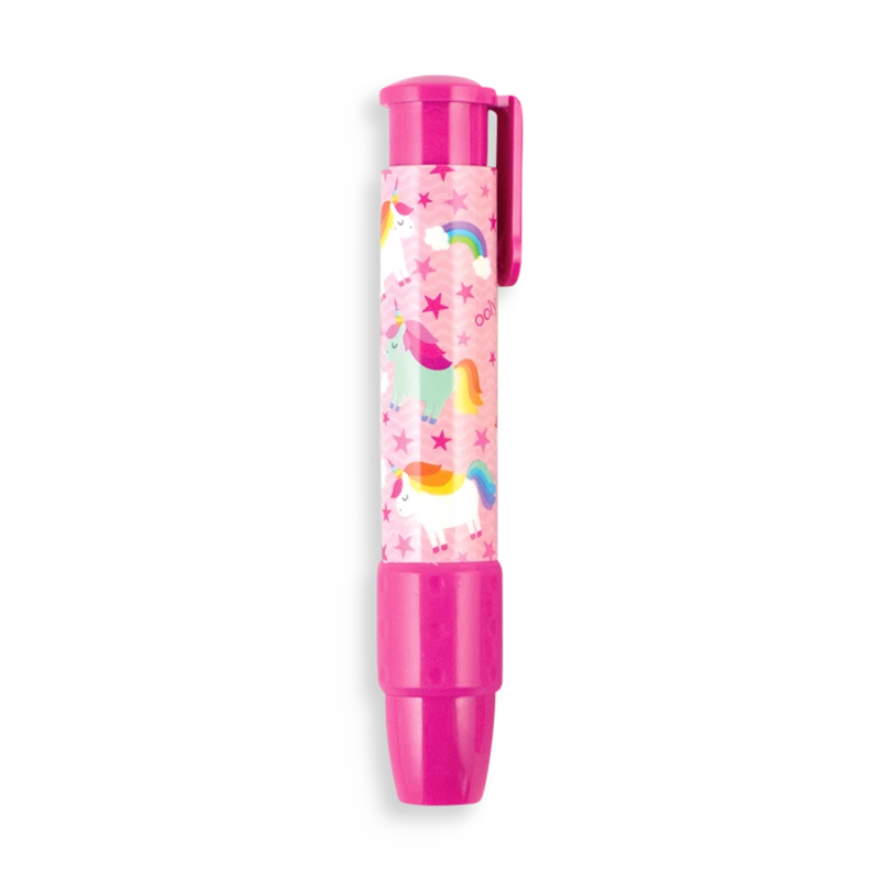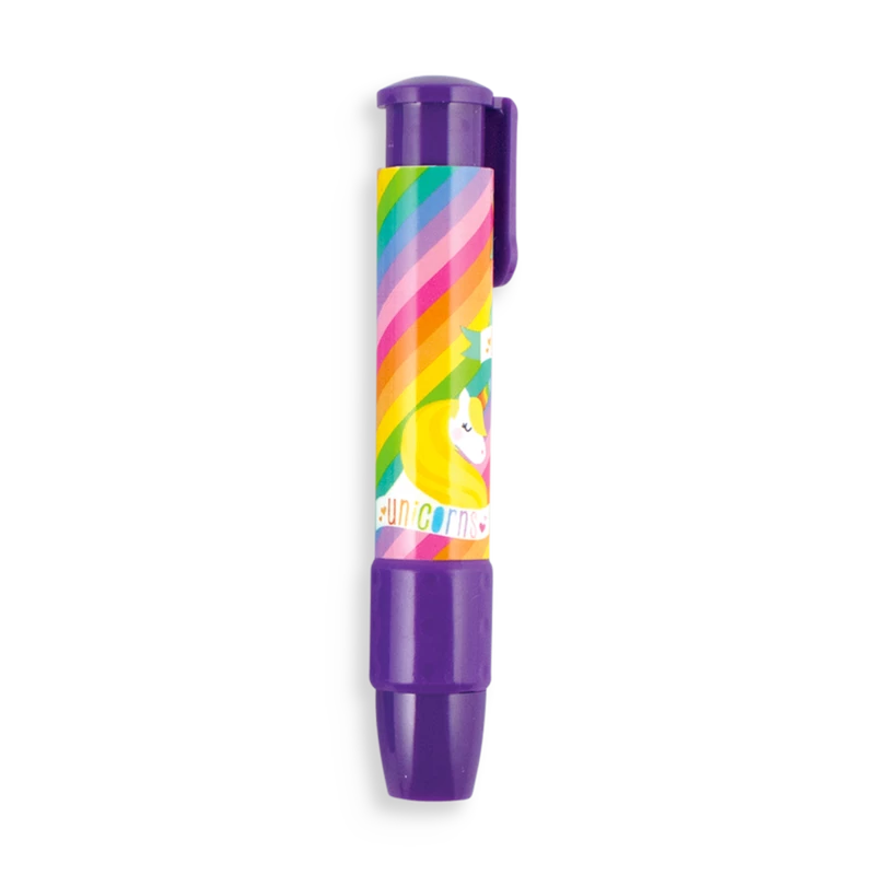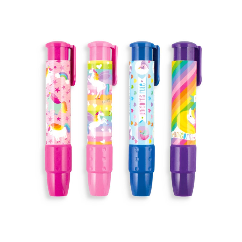 Beautiful unicorns adorn these click erasers making for a magical erasing experience. Unique Unicorns ClickIt Erasers are the simple, fun and adorably cute way to erase pencil markings. ClickIt erasers are basically one big eraser encased in a plastic barrel. Just give a few clicks and you’re ready to use your unicorn eraser. Choose from 4 different colors each with their own unicorn artwork; Blue, Purple, Pink and Hot Pink.