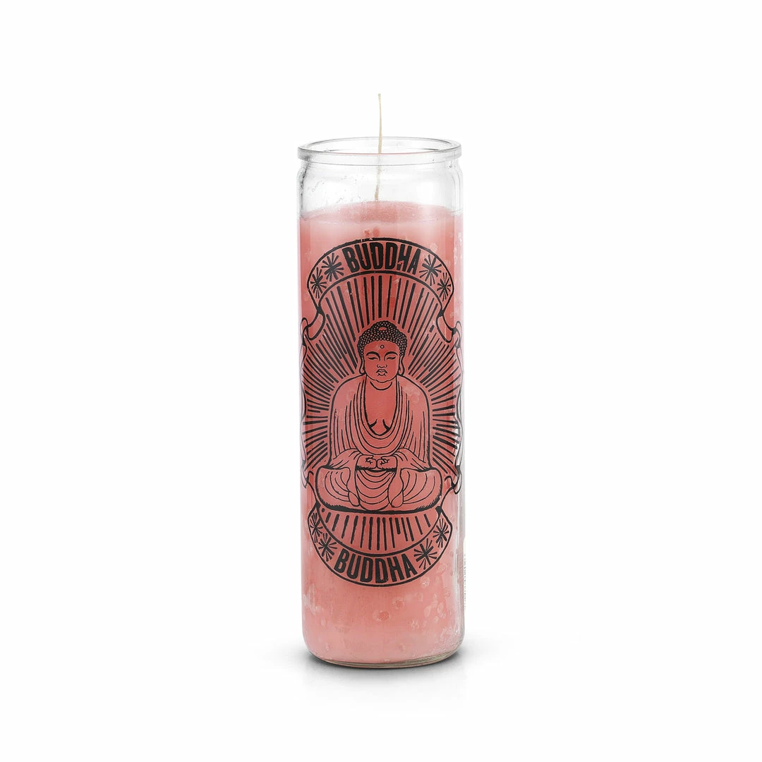 Burn this 7 Day Scented Buddha candle for good luck and prosperity. Burning time of approximately 140 hours; measures 2 1/2″ Wide and 8 1/4″ Tall. Made of 100% Paraffin Wax in imprinted glass pillar holder.