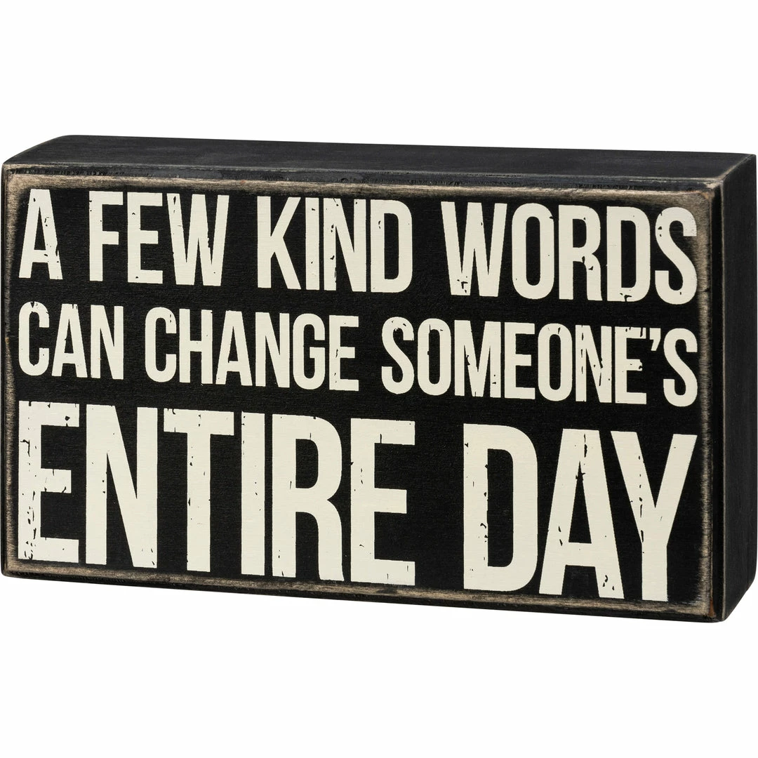 A classic black and white wooden box sign featuring a distressed “A Few Kind Words Can Change Someone’s Entire Day” sentiment. Easy to hang or can free-stand alone. 7.25″ x 4.25″ x 1.75″