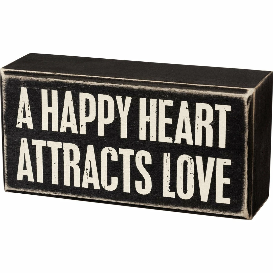 A classic box sign featuring a “A Happy Heart Attracts Love” sentiment. Easy to hang or can free-stand alone. 6″ x 3″ x 1.75″
