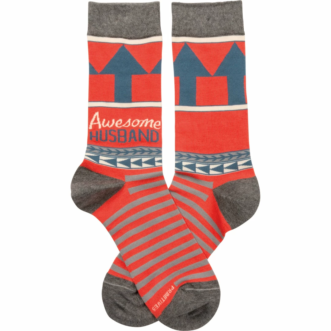 A pair of socks featuring “Awesome Husband” sentiment with geometric pattern. One size fits most. Cotton, nylon and spandex.