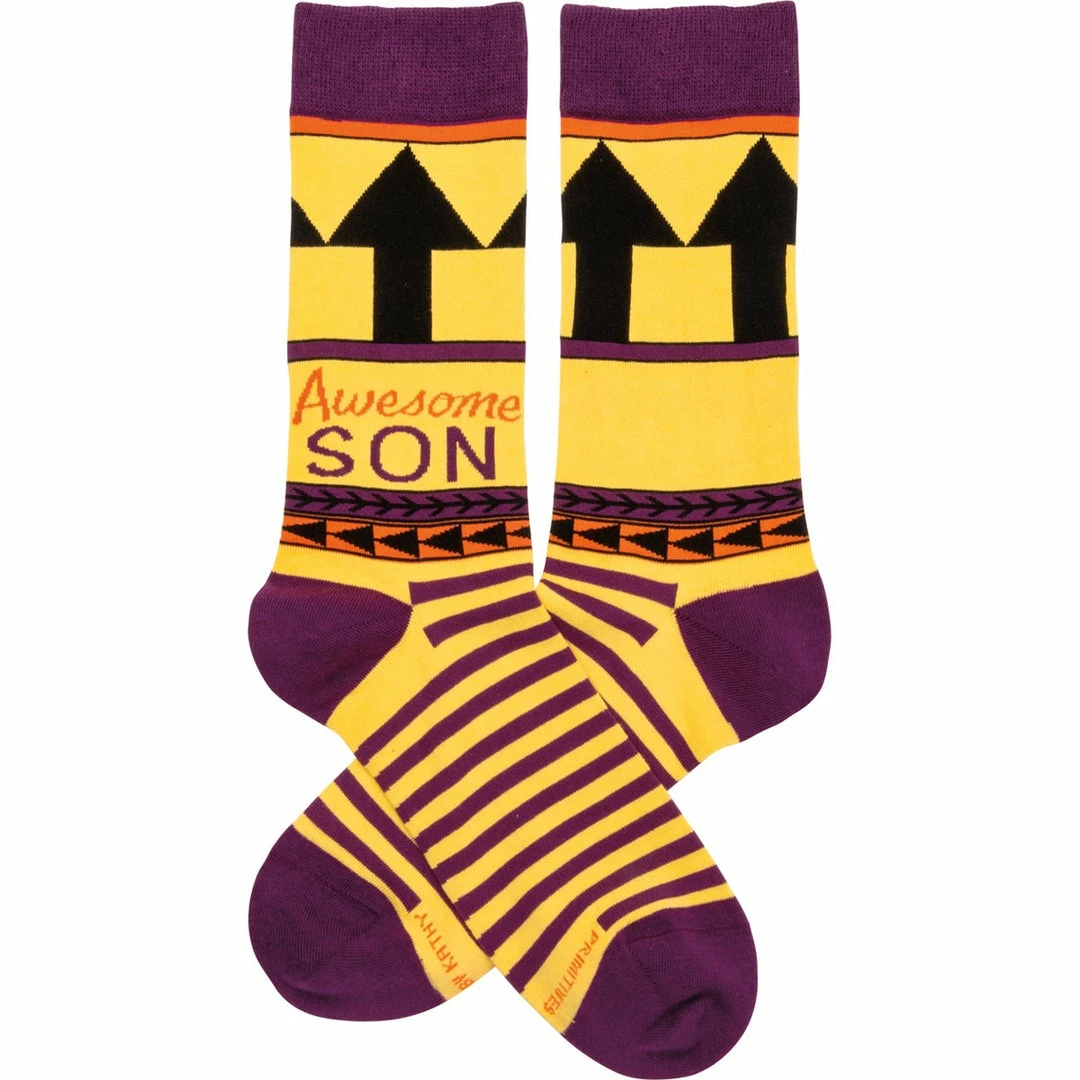 A pair of socks featuring “Awesome Son” sentiment with geometric pattern. One size fits most. Cotton, nylon, spandex. One size fits most.