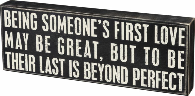 A classic black and white wooden box sign featuring a distressed “Being Someone’s First Love May Be Great, But To Be Their Last Is Beyond Perfect” sentiment. Easy to hang or can free-stand alone. 15″ x 5.50″ x 1.75″