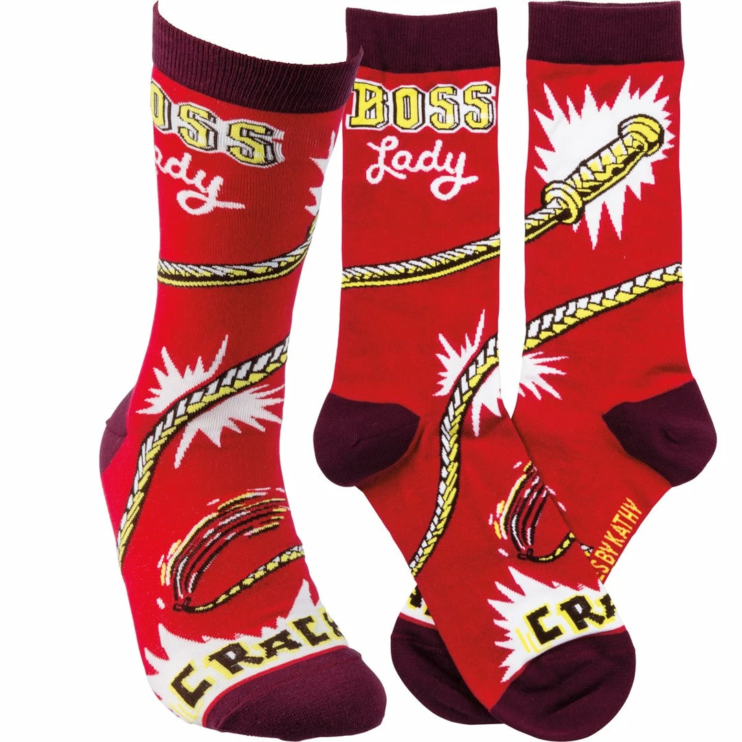 Colorfully printed socks lending “Boss Lady” sentiment with whip design and “Crack” sound effect. One size fits most. Cotton, nylon, spandex. One size fits most.