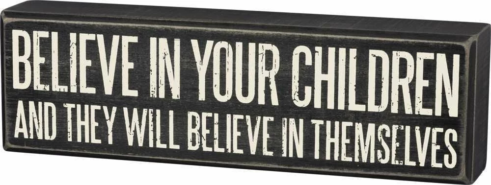 A classic black and white wooden box sign featuring a distressed “Believe In Your Children And They Will Believe In Themselves” sentiment. Easy to hang or can free-stand alone. 10″ x 3″ x 1.75″