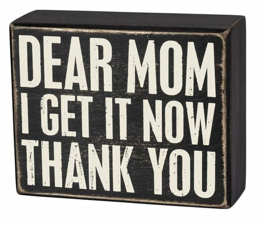 A classic black and white wooden box sign featuring a distressed “Dear Mom – I Get It Now – Thank You” sentiment. Easy to hang or can free-stand alone. 5″ x 4″