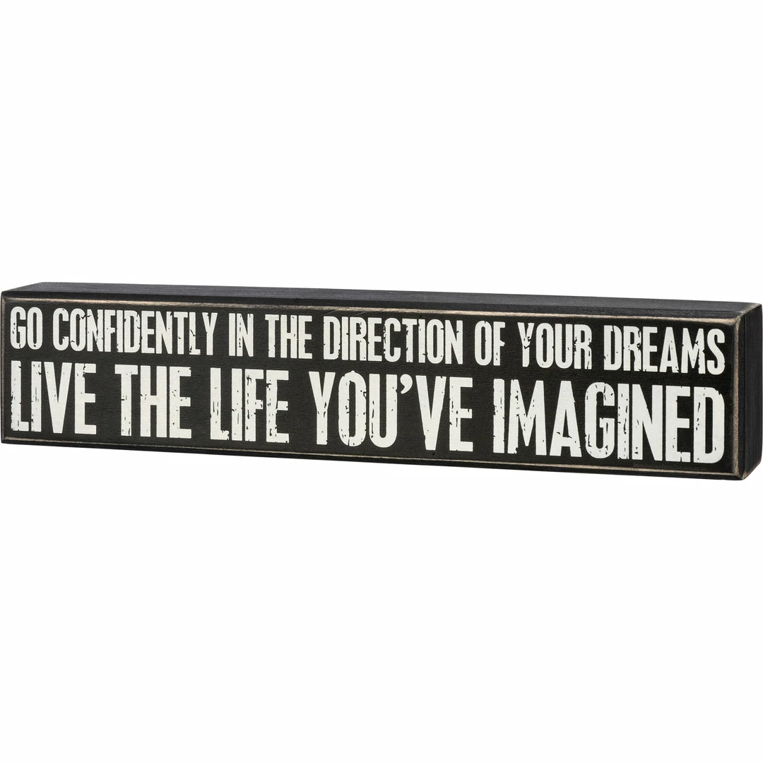 A classic black and white wooden box sign featuring a distressed “Go Confidently In The Direction Of Your Dreams Live The Life You’ve Imagined” sentiment. Easy to hang or can free-stand alone.