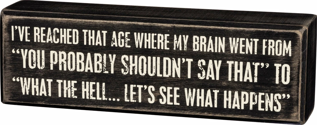 Classic and timeless, a black and white wooden box sign featuring a distressed “I’ve Reached That Age Where My Brain Went From ‘You Probably Shouldn’t Eat That’ To ‘What The Hell… Let’s See What Happens'” sentiment. Easy to hang or can free-stand alone. 5″ x 4″ x 1.75″