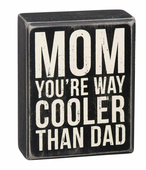 A classic black and white wooden box sign featuring a distressed “Mom – You’re Way Cooler Than Dad” sentiment. Easy to hang or can free-stand alone. 4″ x 5″ x 1.75″