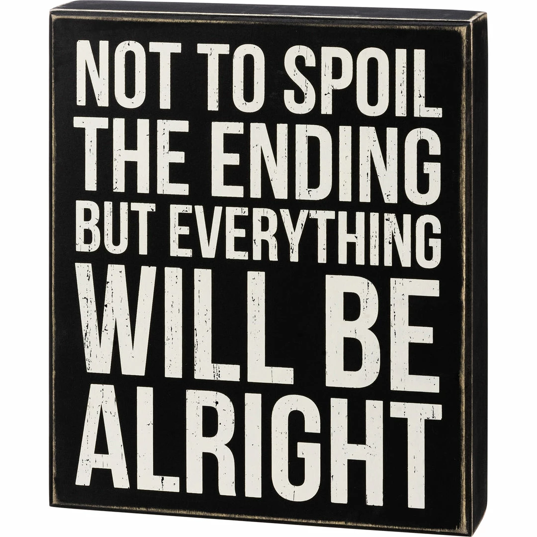 A classic black and white wooden box sign featuring a distressed “Not To Spoil The Ending But Everything Will Be Alright” sentiment. Easy to hang or can free-stand alone.
