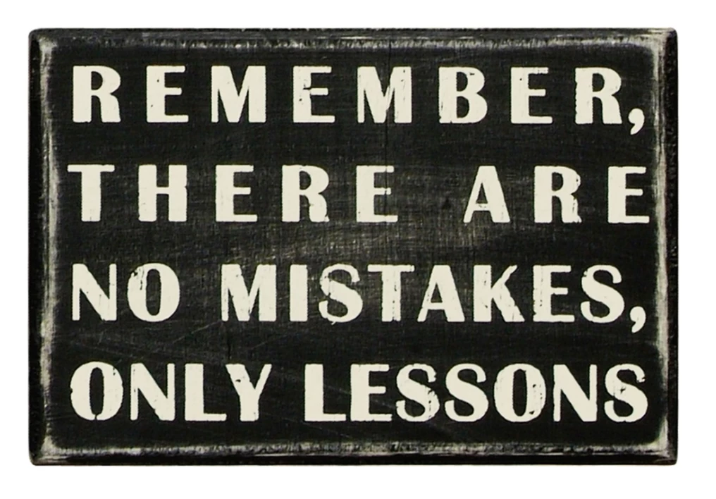 A classic black and white wooden box sign featuring a distressed “Remember, There Are No Mistakes, Only Lessons” sentiment. Easy to hang or can free-stand alone.