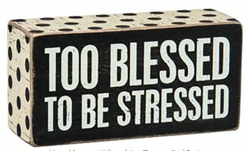 A classic black and white wooden box sign featuring a distressed “Too Blessed To Be Stressed” sentiment with polka dot trim designs. Easy to hang or can free-stand alone.